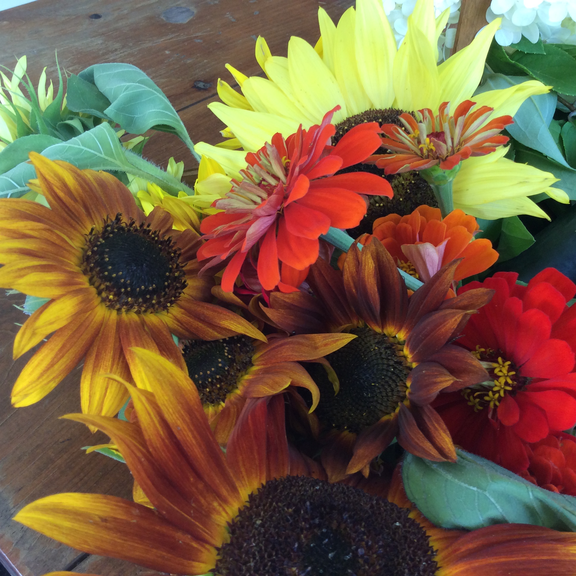 FHFB plants rows and rows of different sunflower varieties, along with zinnias of all heights and colors, in the field garden. They are spectacular when grouped together in a simple mason jar.